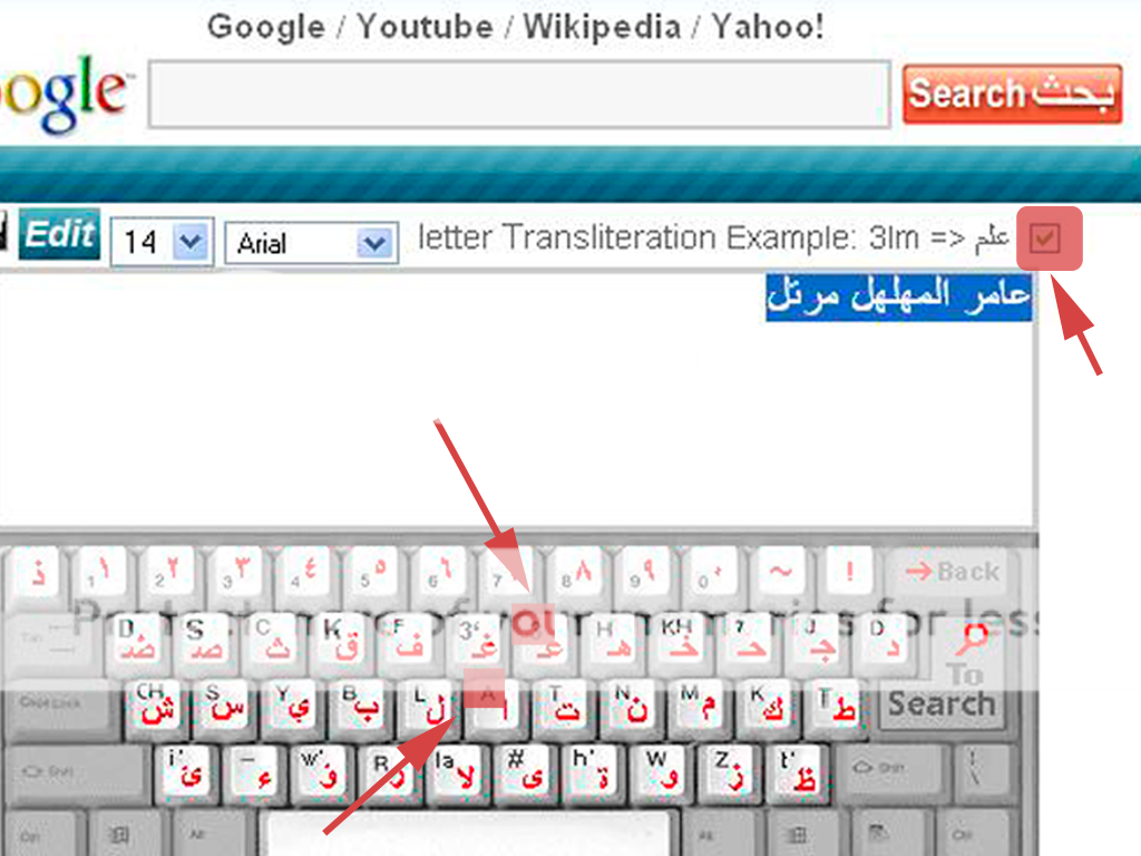 Situs yang beralamat di www.arabic-keyboard.org ini betul2 gapang banget dipake. Tinggal klik-klik keyboard berbahasa arab. Hasilnya bakalan nongol di layar atasnya. Kalo ta’ab ngeklik trus (emang maen CS?) bisa kok pake fasilitas lain. Tinggal centang kotak di sebelah kiri atas. Entar kalo kita mo nulis arab tinggal disesuaiin dengan tulisan latin di atas huruf hijaiyyah tsb. (kalo kamu perhatikan di setiap huruf arab mesti ada huruf latin di atasnya!) Misal : kalo mo nulis ‘alif’ ya pencet ‘a’, kalo ‘ain’ pencet angka ‘3’ (emang kalo diperhatikan 3 merupakan ع kebalik!).
